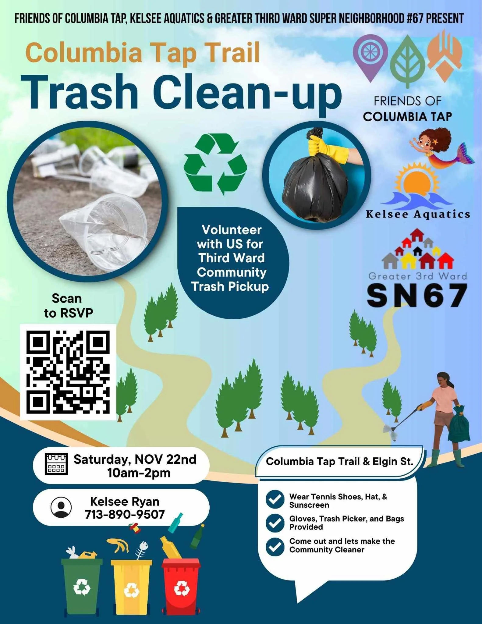 Join local volunteers for a Third Ward Community Trash Pickup along the Columbia Tap Trail on Saturday, November 22nd from 10 AM–2 PM.