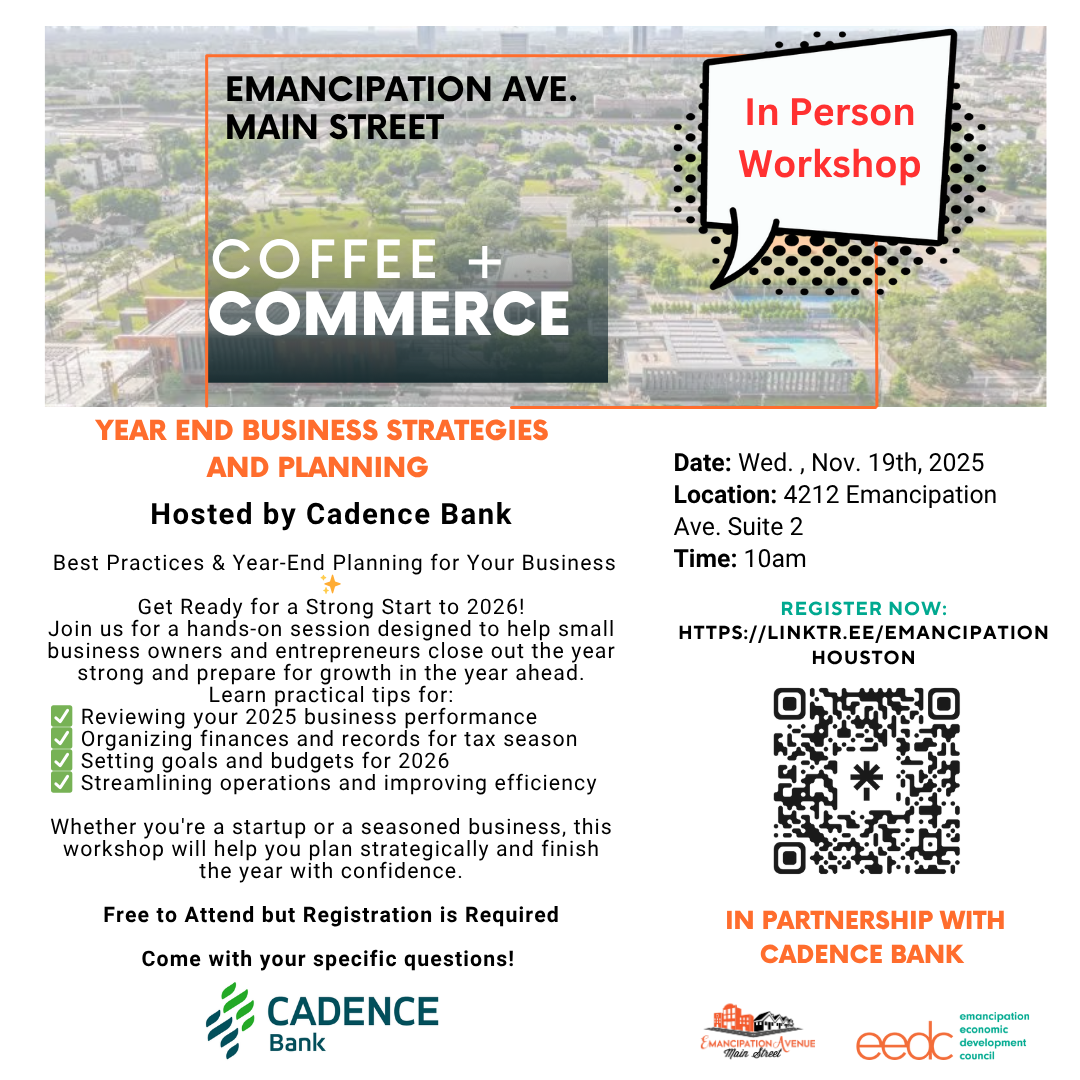 Join Emancipation Ave. Main Street and Cadence Bank for a free, hands-on session on Wednesday, November 19, 2025, at 10:00 am.