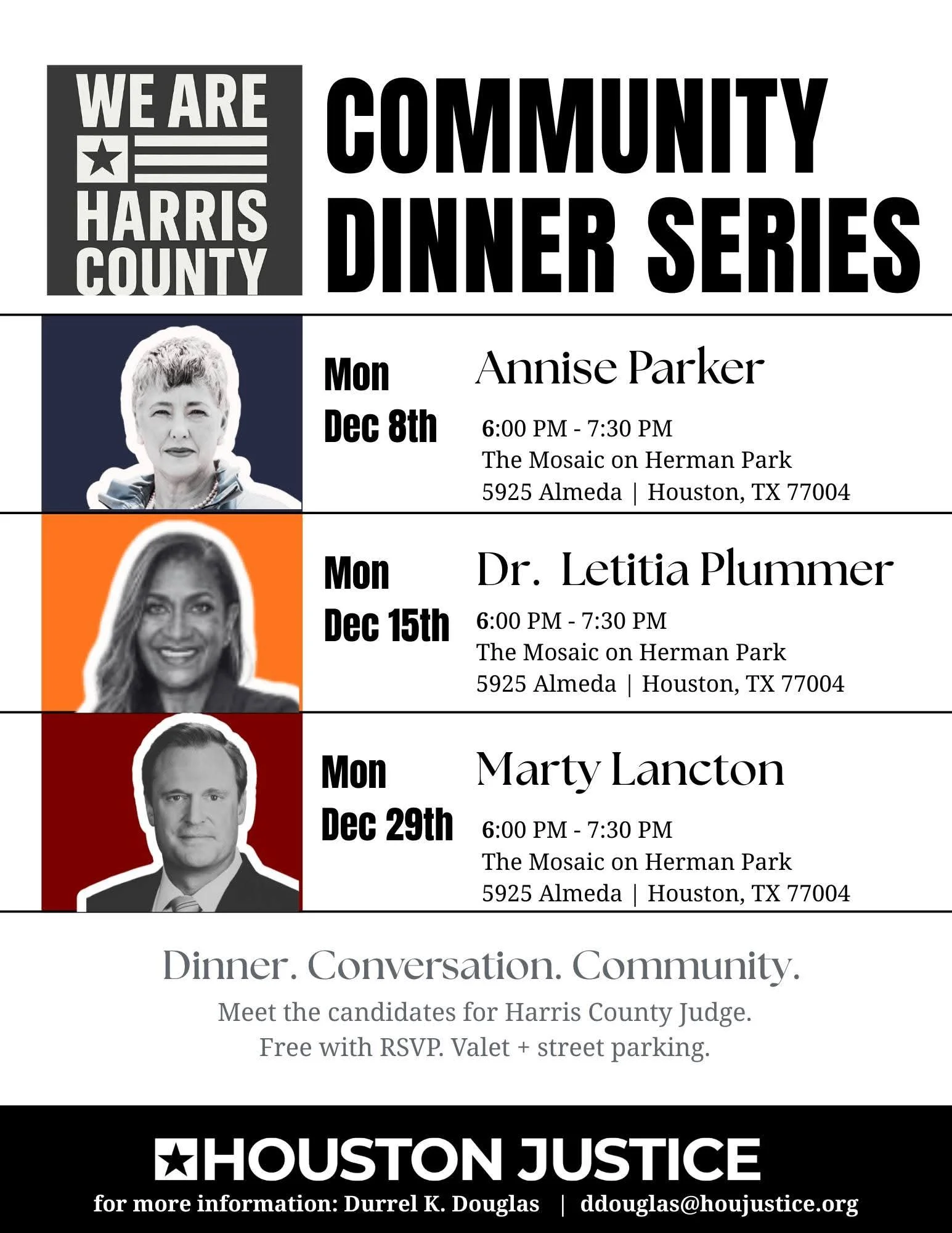 This December, Houston Justice invites you to a three-part Community Dinner Series featuring candidates for Harris County Judge. Each dinner offers an opportunity to engage in meaningful conversation, learn about local leadership, and build community.