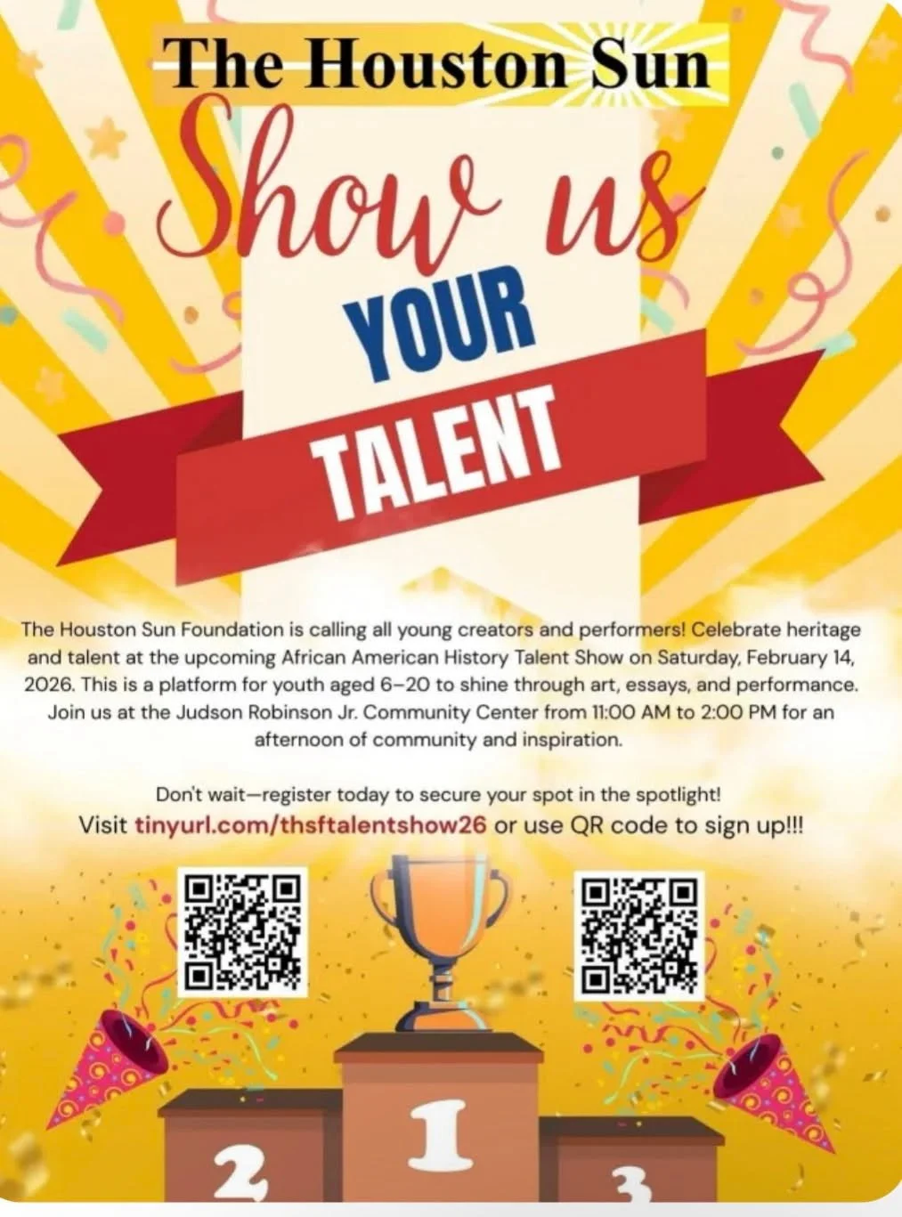 The Houston Sun Foundation invites youth ages 6–20 to showcase their gifts at the African American History Talent Show on Saturday, February 14, 2026!