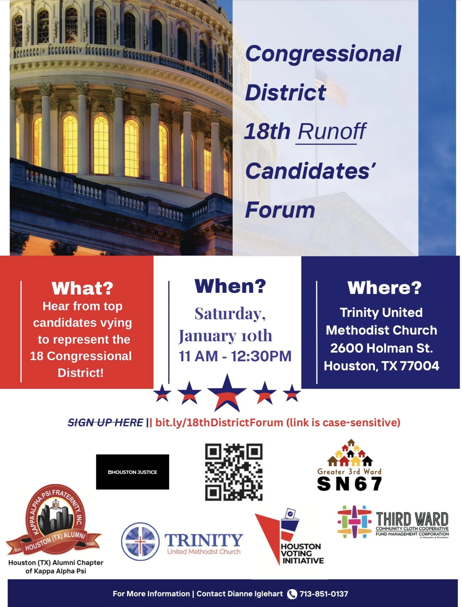 Don’t miss the opportunity to hear directly from the candidates running to represent Congressional District 18. The Runoff Candidates’ Forum will take place on Saturday, January 10th from 11 AM–12:30 PM at Trinity United Methodist Church (2600 Holman St.).